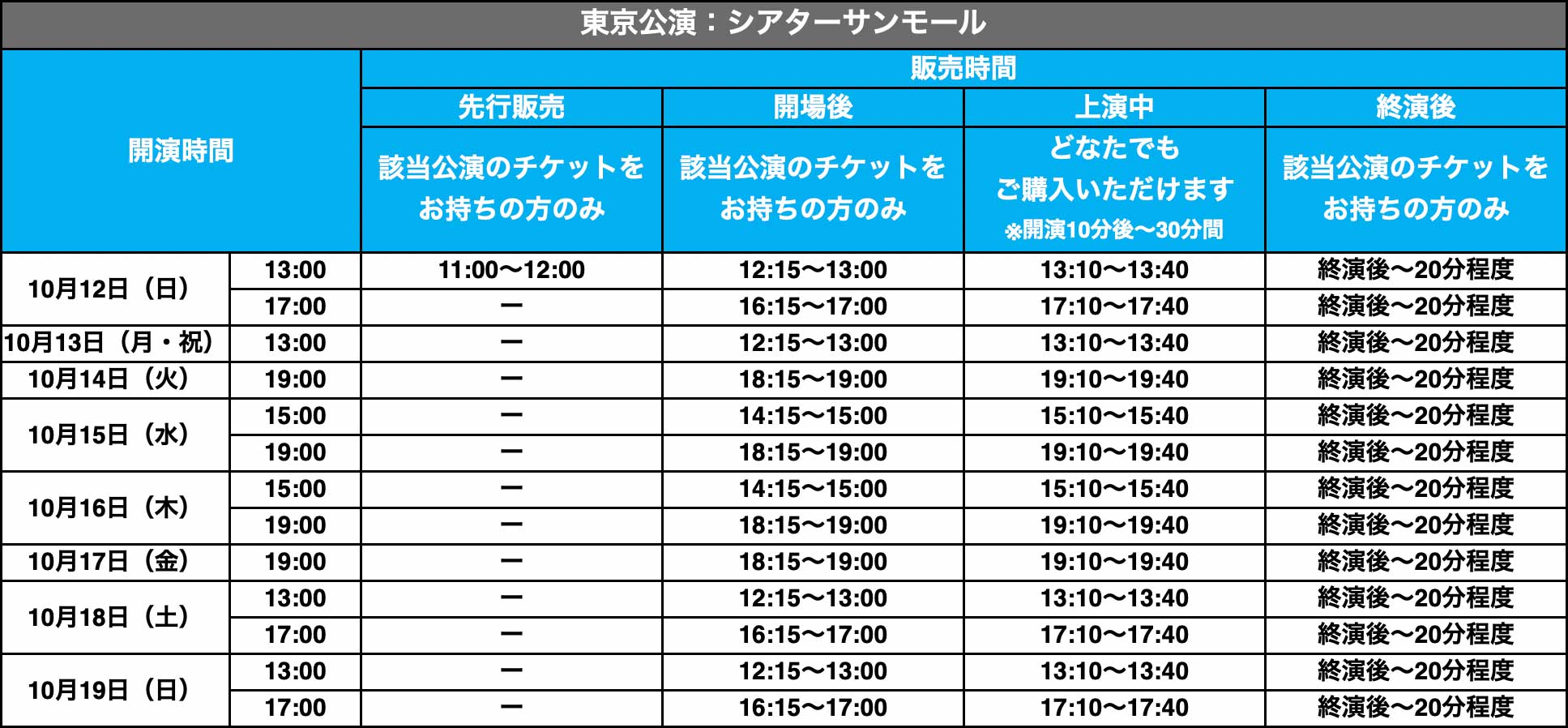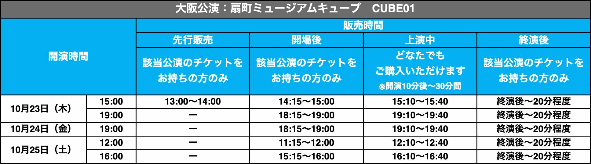 会場でのグッズ販売におきまして、公演により販売時間・購入可能者が異なります。